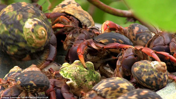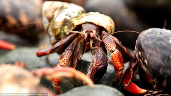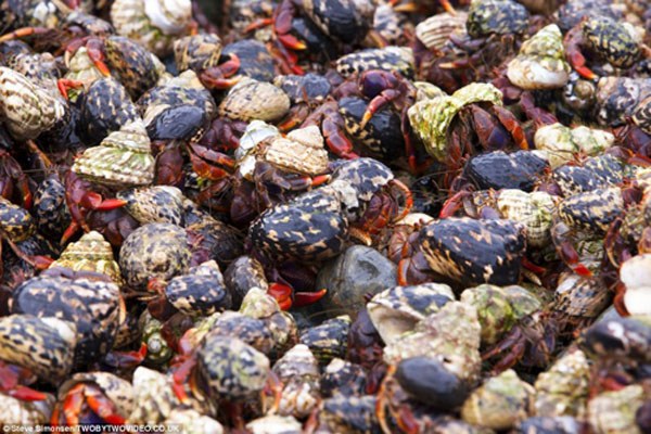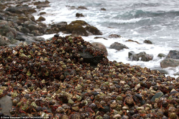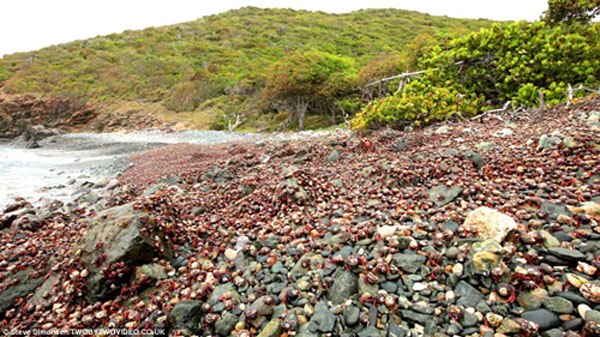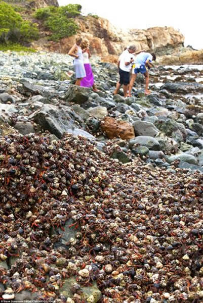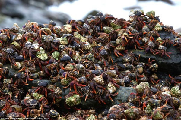 据英国《每日邮报》9月14日消息,每年8月,美属维尔京群岛的圣约翰小岛上都会上演这样奇异的一幕:成千上万只螃蟹“隐士”涌入它们繁殖的水域,交配之后,母螃蟹便把它们的受精卵排在海里。新生的小螃蟹在返回陆地前,需要在海水中呆几个月。