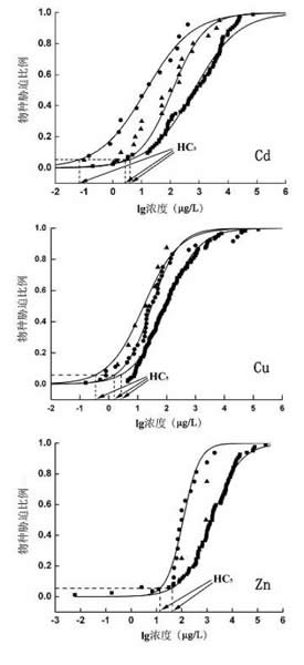 这是镉(Cd)、铜(Cu)和锌(Zn)对水生生物的个体水平急性、慢性和基因表达效应数据的SSD曲线。“■”表示急性毒性数据,“●”表示慢性毒性数据,“▲”表示基因表达效应数据,曲线由对数-逻辑斯谛函数拟合,HC5表示5%的物种受胁迫的污染物浓度。