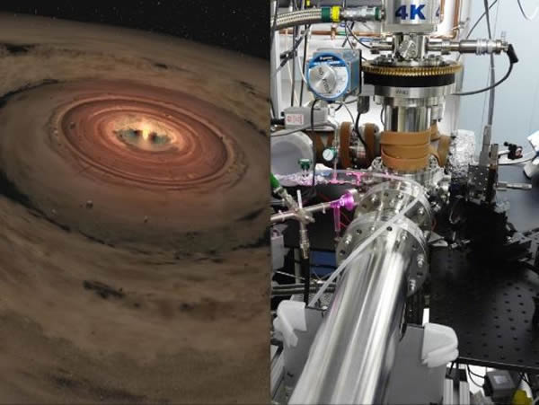 研究人员正在实验室中模拟太阳系边缘甚至更遥远空间中冰粒表面有机质的生成和行为模式。这张图像的右侧栏所能展示的是喷气推进实验室的实验设备,而左侧栏所展示的则是一副艺术想象图,展示的是一个年轻的恒星周围围绕运行的原始行星尘埃盘