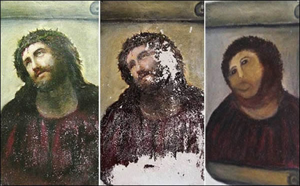 西班牙一老妇好心修补壁画令耶稣被毁容