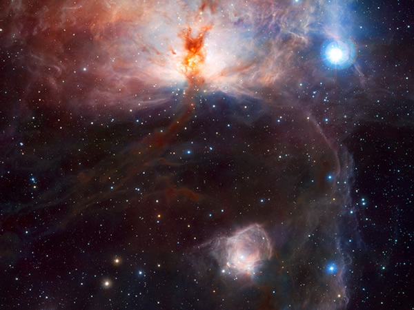 美国太空网近日发布了火焰星云隐匿的火焰图片。这张利用世界上最大的巡天望远镜——可见光和红外巡天天文望远镜(VISTA)拍摄的图片显示了恒星形成区、位于猎户座的火焰星云NGC 2024及周围的壮观景象。可见光下观测到该星云的核心部分完全被模糊的尘埃遮挡,而利用VISTA的红外光拍摄则显示了星云中央非常年轻的恒星群。视野宽阔的VISTA景象还包括火焰星云NGC 2024中央下部反射的光芒,以及右下角马头星云(巴纳德33 )幽灵般的轮廓。右方明亮的蓝色恒星是形成猎户座腰带的三大恒星之一。