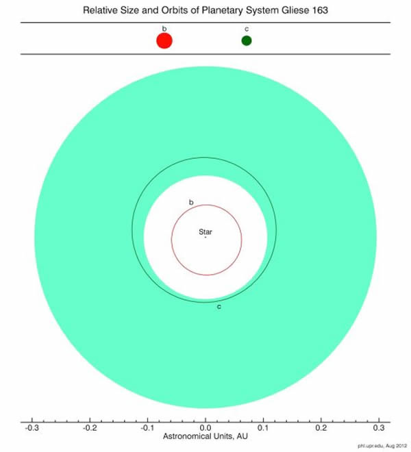 这是一幅示意图,展示的是围绕恒星Gliese 163运行的最内侧两颗行星(即b和c)的相对大小。另外科学家们高度怀疑在更外侧的轨道上还有第三颗行星(d,图上没有标出)。行星Gliese 163c的运行位置恰好位于该恒星的宜居带范围(绿色区域)内,因此这颗行星尽管温度较高,但仍然具备潜在的宜居环境,但究竟是否宜居要需取决于其大气结构和物质组成成分