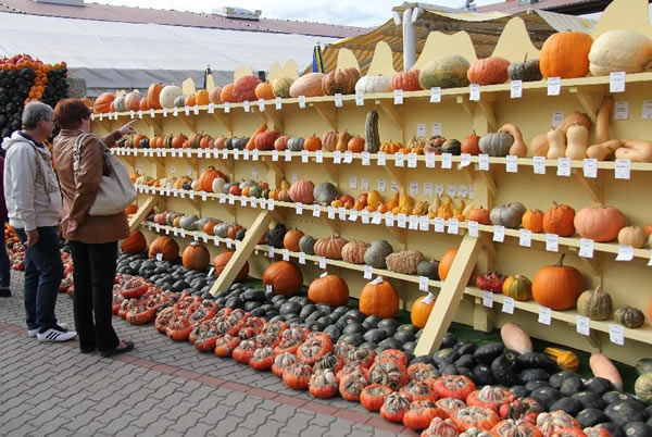 9月23日,在德国小镇克莱斯多夫的南瓜称重大赛现场,参观者欣赏不同品种的南瓜。