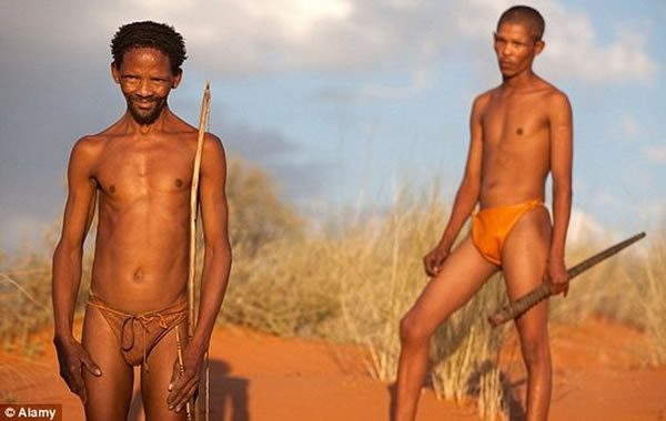 富含基因特征的San部落居民,图中两个San部落男子正在非洲南部喀拉哈里沙漠狩猎