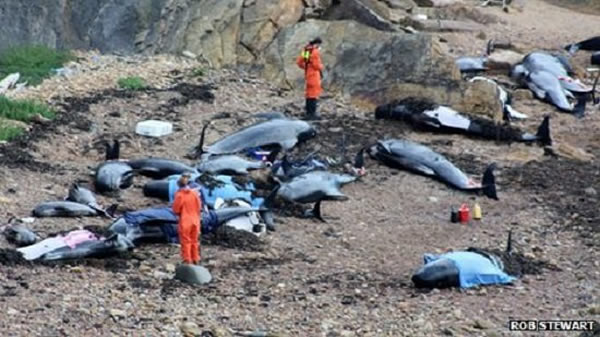 搁浅的每一条巨头鲸都接近20英尺(6米)长,继大规模搁浅事件之后,另外十只鲸鱼被英国潜水和海洋生命救援组织的兽医救治之后离开了浅水滩。根据苏格兰农业学院(SAC)的兽医调查官员安德鲁-布朗劳所说,鲸鱼靠近海岸并且搁浅存在许多原因。他说到:“对于巨头鲸最初的研究结果表明大部分鲸鱼都是健康的。悲哀的是搁浅事件在鲸鱼物种中屡见不鲜,许多动物的搁浅似乎都是因为它们跟随着一只生病的、迷路的或者惊慌失措的个体所导致的。”