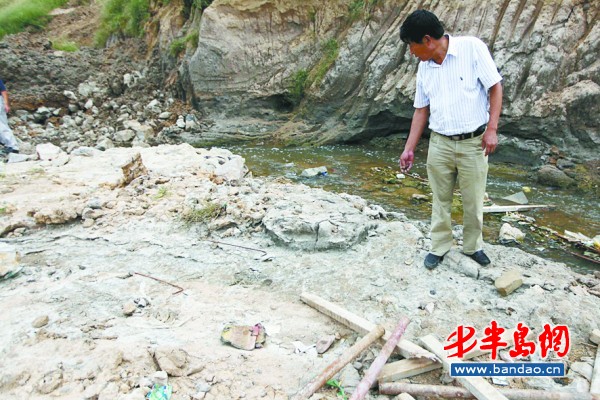 随后,在潘进和的带领下,记者跟随着李居发一起来到了发现骨化石的地点。记者注意到,发现处的土层颜色确实发黑,与周边形成反差。“这里属于台头龙山文化遗址。根据之前的走访我们了解到,这条河道是新中国成立后修建的,在这条河的北侧其实还有一条古河道,现在已成为村庄。”李居发说,这也符合古人依河而居的特点。另外,辛安地处珠山脚下,北临胶州湾,东临黄海,既有适于农耕的丘陵与近海平原,又有适于捕捞的绵长海岸线,并且纬度适中,气候湿润,也是人类生存的理想之地。