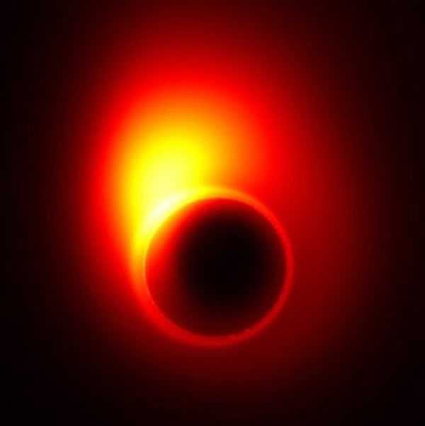 图1中显示了由计算机模拟出的室女座M87星系中央黑洞极端引力场扭曲位于事件视界附近喷流的情形,其中部分辐射被引力严重弯曲成一个环形,这也是我们通常所说的黑洞“影子”。科学家们将位于夏威夷、亚利桑那州和加利福尼亚州的射电望远镜阵列联合,形成一个“事件视界望远镜”(EHT),其观测能力是哈勃空间望远镜的2000倍。天线指向M87星系方向,这是一个距离银河系5000万光年的椭圆星系,其中央存在一个超大质量黑洞,质量达到太阳质量的60亿倍,科学家通过“事件视界望远镜”可观测到黑洞边缘附近发出的光线,这个可视的区域就被称为事件视界。