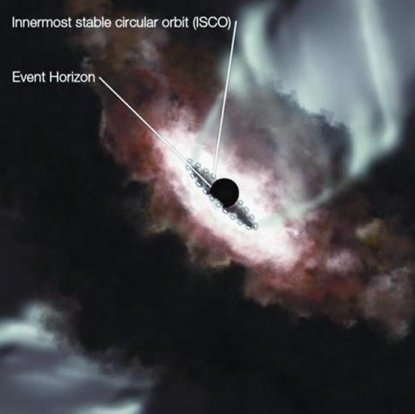 描述本次黑洞半径测量区域与事件视界之间的位置关系图,吸积盘最内侧的测量半径达到事件视界的5.5倍