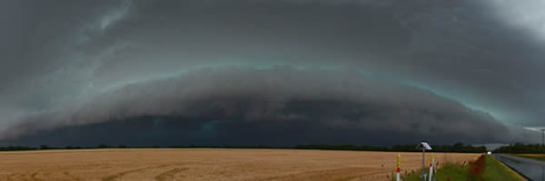 当摄影师布赖恩·约翰逊(Brian Johnson)于5月30日拍下上面那张风景照(上)时,风暴前沿正在靠近威奇托市以北的一个叫Kechi的小城市。这幅照片显示了一块收割后的麦田上空的一个低空楔形云团。这种云团叫做架状云(Shelf clouds),是弧状云(arcus cloud)的一种。架状云往往会带来具有破坏性的大风。