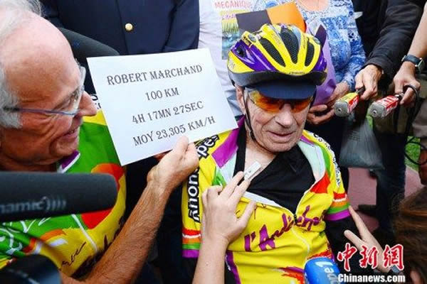 法国百岁老人马尔尚28日打破百岁老人骑自行车100公里的最快纪录。