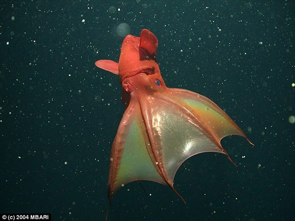 这种鱿鱼尽管被称为“来自地狱的鱿鱼”或“吸血鬼鱿鱼”,事实上它们并不会杀死任何活猎物。相反,它们利用两条细线一样的细触须捕食从海面沉入到海底的海洋生物腐尸。这一奇怪的物种生活于深海之中,身体呈暗红色,像斗篷一样的网状,长有巨大的蓝色眼睛和八条手臂。