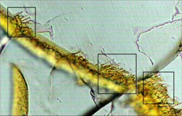 显微镜观测下的一小片火星喀拉陨石切片。裂痕(棕褐色)和隧道(盒子里)在体积和形状上都与携带DNA的陆地岩石相似。这些是如何形成的目前还是未知,然而并没有发现DNA的存在。