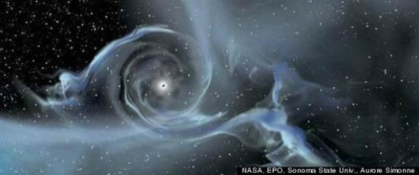 另外一个可以参与到“宇宙最小物体评选大赛中来的竞争者就是位居黑洞核心的奇点。这里是一副艺术想象图,展示的是一个黑洞正从它的伴星那里攫取物质