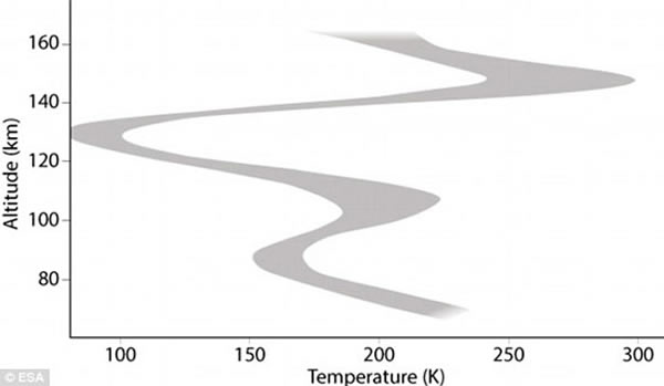 金星以其厚厚的二氧化碳大气和如烤炉般高温的地表特征而出名,并被人们描述成地球荒凉的“恶魔双胞胎”。但据欧洲太空总署的“金星特快号”卫星五年的观察数据分析显示,在金星地表上空125千米位置的高层大气处,温度十分低,甚至达到 -175℃的超低温。由于金星离太阳十分近,因此这处冰冷层出现的十分诡异,甚至比地球任何位置的气温都要低。