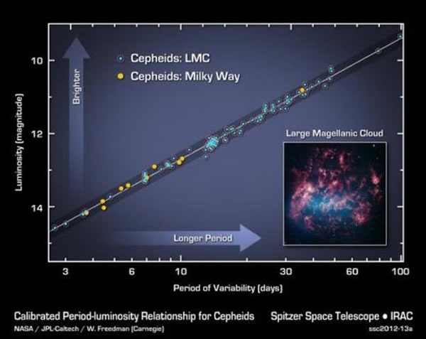 斯皮策红外空间望远镜对造父变星周光关系的调查,可计算出宇宙大小、年龄和膨胀速率