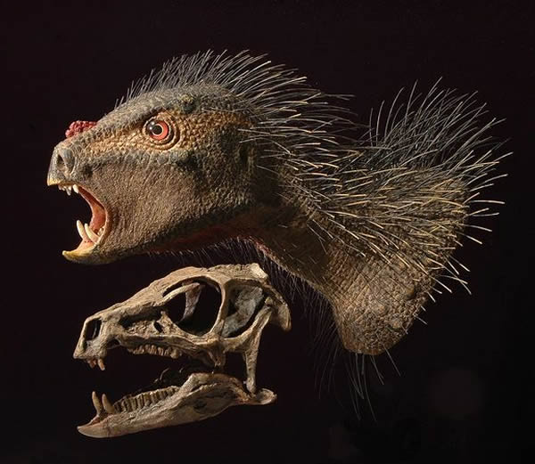 美国科学家最近对化石的研究发现,一种侏儒恐龙新物种行走在史前地球上,它长着像吸血鬼一样的尖牙,身上布满竖立的毛发,就像一头敏捷的豪猪。