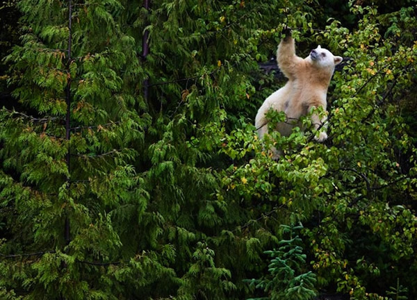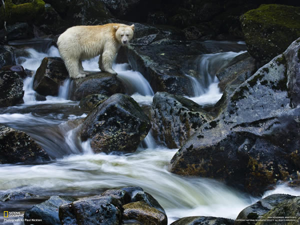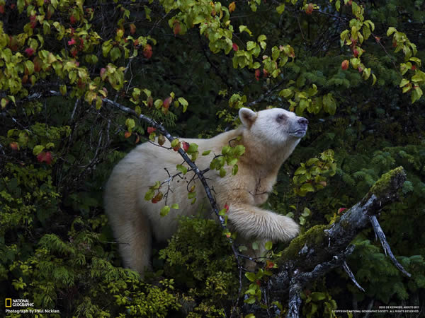 这组图是由摄影师Paul Nicklen为国家地理杂志所拍摄的。这些白灵熊(卡莫德熊)并非北极熊,它们生活在加拿大大熊雨林,英国哥伦比亚海岸与温哥华岛之间,阿拉斯加东南部等地。
