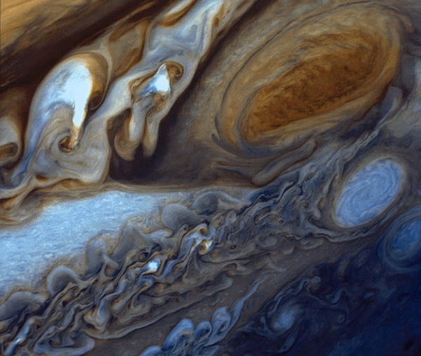 这张照片是由旅行者1好在1979年拍摄的,这就是著名的木星大红斑,它已持续存在超过1个世纪。这个大红斑结构非常巨大,其内部足以吞下3个地球。
