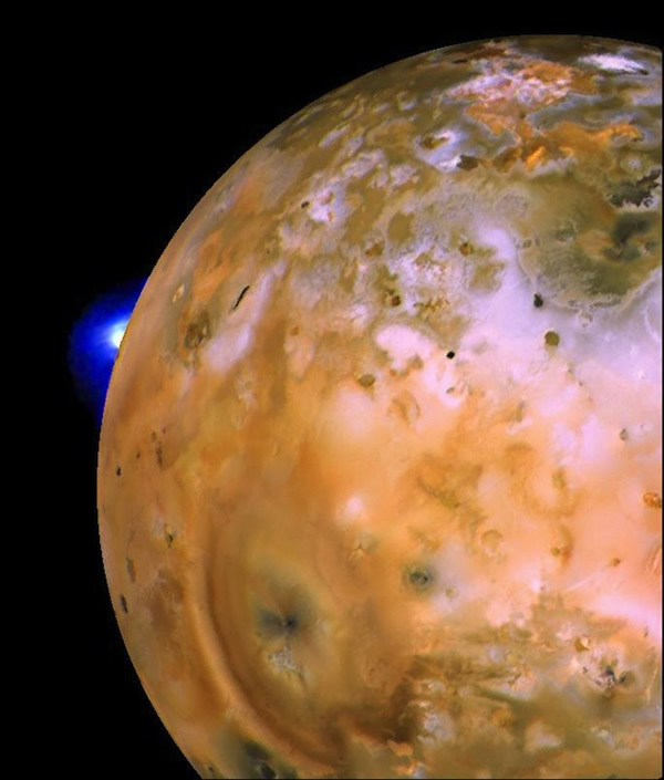 旅行者号探测器让天文学家们得以首次近距离观察到木星的卫星系统。飞船的探测结果在木卫一上发现了剧烈的火山活动,这是由于木星引潮力导致木卫一被压缩或拉伸引起的内部加热。这张图像显示了木卫一表面洛基火山的喷发场景,这是一个巨大的活火山凹地,也是一个活跃的岩浆湖。