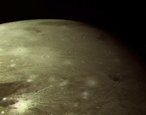 美国宇航局一共发射了两艘旅行者号飞船,其中旅行者1号飞船于1977年9月5日发射升空,开创了行星探测史上的黄金时期。今年的9月5日,旅行者1号飞船迎来了它升空35周年的纪念日。图为木卫三景色,这是太阳系中最大的卫星,表面遍布边缘清晰的陨石坑,明亮的辐射条纹透露了它相对年轻的表面。
