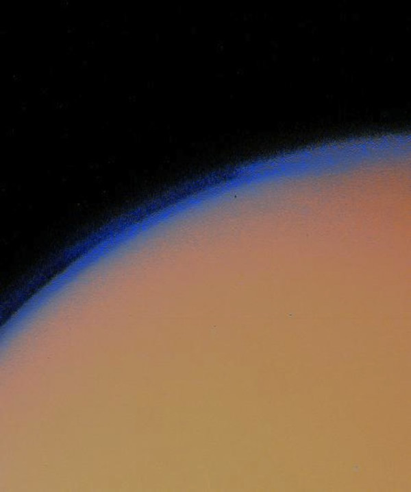 这张照片拍摄的是土卫六,土星的第一大卫星。它拥有一层浓密的橘色大气层,其主要成分是甲烷和乙烷。