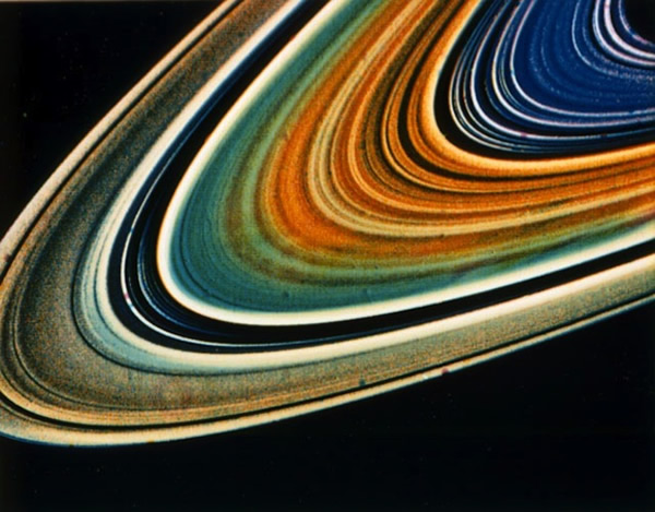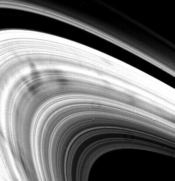这张照片是真彩色下的土星光环高分辨率照片,在光环表面可以看到著名的辐条结构(spoke)。天文学家们认为这是土星的电磁场和光环中的物质之间发生的某种相互作用引起了这种现象,然而对于这种现象的最终解释仍然是一个待解之谜。