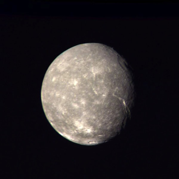 这张照片上的是天王星的最大卫星:天卫三。这颗卫星表面遍布陨石坑,这是一个寒冷的灰暗世界,其表面还有很多峡谷和裂谷系统。