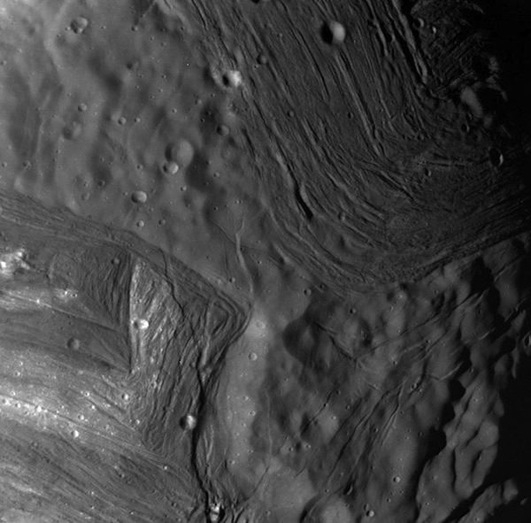 这张照片上的是天卫五,天王星乃至整个太阳系中最诡异的卫星之一。这颗卫星的整个地表呈现出一种怪异的拼接特征,这显示在它的地质历史上曾经发生过严重的变动。