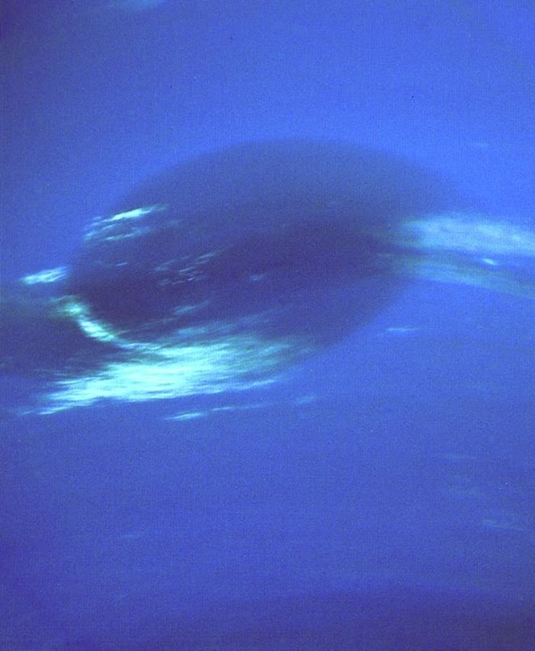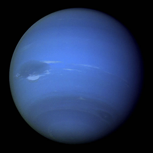 旅行者2号是迄今唯一造访过海王星的人类探测器,这是太阳系中最遥远的大行星,时间是在1989年。在这张海王星全身照中可以看到这颗巨行星大气中注明的大黑斑,这是一个呈现周期性出现和消失规律的大气甲烷气体云洞。