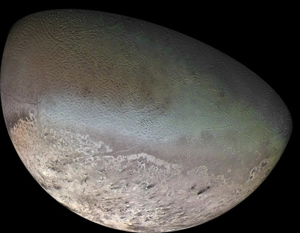 这张合成图像展示的是海王星最大的卫星——海卫一的表面。这张图像上可以分辨出很多细节特征。这颗卫星的地表是迄今在太阳系中记录到最低温度的地点,达到零下200摄氏度。整个卫星的地表被一层氮冰覆盖,在其表面还有一些略显粉红色的甲烷冰沉积层。