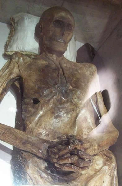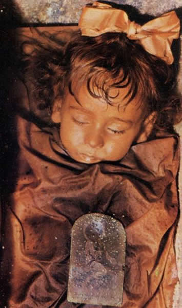 这具木乃伊因为保存的太过完好而令人看后毛骨悚然。她看起来就像睡着了一样随时都会醒来。小罗萨莉娅-隆巴多1920年因肺炎去世时只有两岁,伤心欲绝的父亲希望找到一种可以让她永不腐化的方法,于是他请著名人体防腐专家萨拉菲亚把尸体制成木乃伊,很显然萨拉菲亚的处理非常到位。
