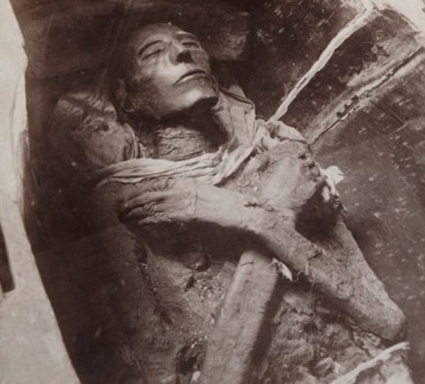 这是埃及法老王拉美西斯二世的遗体。它被认为是世界上保存最完好的一具木乃伊。裹在拉美西斯二世身上的亚麻布上写满象形文字,说明在拉美西斯二世第一次被埋葬在帝王谷后,由于盗墓行为被迫被移动了。这具木乃伊拥有红头发,古埃及红发人与塞斯有关,塞斯是杀死古埃及冥神奥西里斯的神。