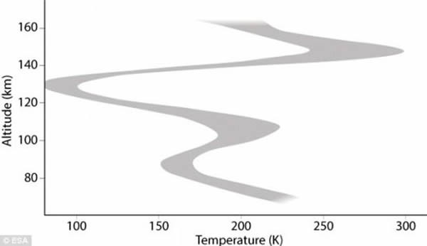 金星因其由二氧化碳组成的厚厚的大气层和如烤炉一般炙热的地表而著称,而且它常被描绘成是地球荒凉的“恶魔双胞胎”。然而,对欧洲航天局“金星快车”在5年间收集的观测数据进行分析,科学家已经发现,距离金星地表大约125公里的大气处的温度低达零下175摄氏度。尽管金星距离太阳更近,但是这个古怪的冷层比地球大气层的任何部分都更加寒冷。当太阳发出的光穿透金星大气层,该卫星沿着明暗界线(金星亮区和暗区之间的分界线)观察不同高度的二氧化碳气体分子的密度时,获得这一发现。然后科学家把二氧化碳密度的信息与各个高度的大气压的数据相结合,就能计算出相应的气温。