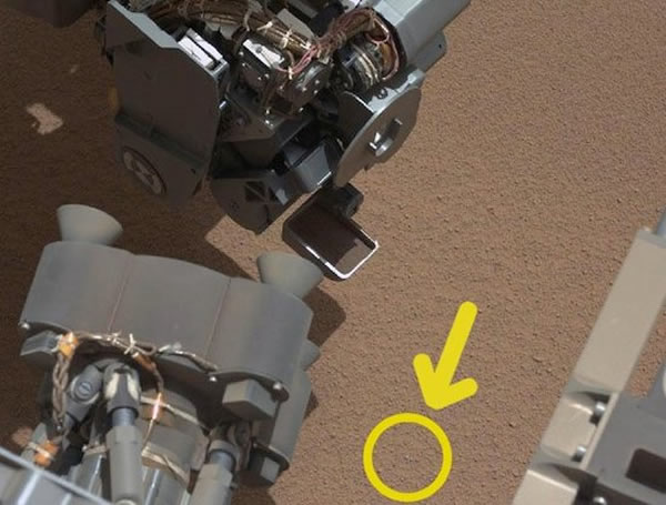 图中黄色圆圈所指的物体即是工程师发现的不明物体,或为好奇号零部件脱落