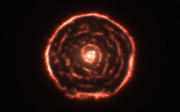 天文学家近日使用阿塔卡马大型毫米波/次毫米波阵列(ALMA)观测意外地发现了红巨星R Sculptoris周围物质形成了诡异的螺旋结构,此特性在以往的观测任务中并未发现,科学家推测红巨星附近存在一颗未知的伴星,由于其旋转的缘故造成了物质分布出现不寻常的特征,这是第一次在红巨星周围发现螺旋物质分布,同时也预示着天文学家能首次绘制该螺旋结构的三维立体信息。从图中可以看出,外层结构为圈形分布,呈现出非常明显的螺旋结构。