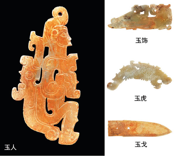 在朱砂之间,亦即墓主的周围出土了数量较多的玉器,器形有玉琮、玉戈、玉虎、玉人、玉觿、玉璜、玉环、玉玦、玉牌饰等等,另有玛瑙、绿松石串珠等。内椁下有殉犬一只,应象征“腰坑”,但没有明确的范围。