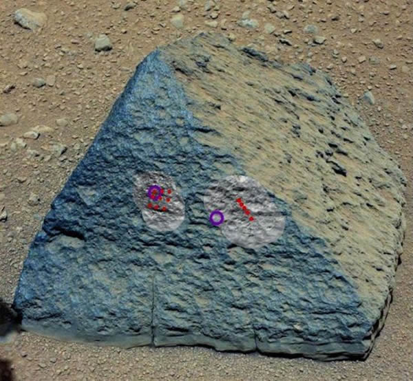 “好奇”号发现的一块岩石,被命名为“杰克-蒂耶维奇”,已对其进行了几天研究。照片中的红点为“好奇”号的激光轰击点,紫圈为X射线束轰击区