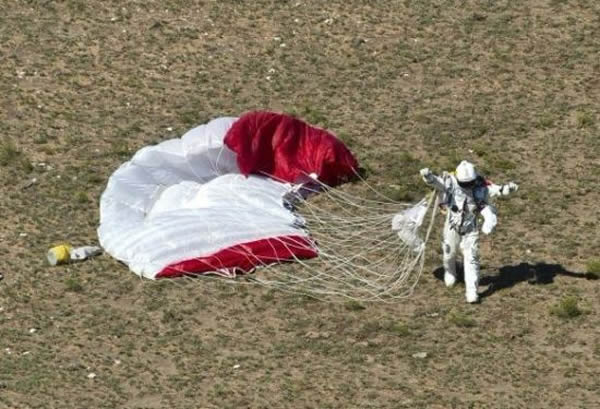 完成宇航服加压后,这位极限运动员头部向下纵身跳向地球,按照预测,其下降速度在短短40秒内可从0飙升至1120公里/小时,超过了音速。在距离沙漠着陆点只有最后1500米时,他打开降落伞,并最终成功着陆。