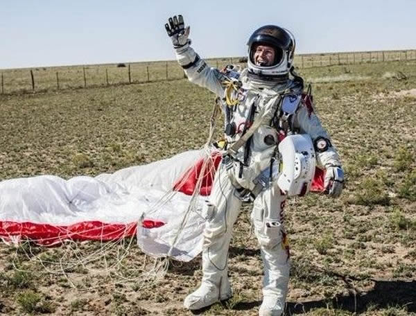 奥地利冒险家鲍姆加特纳从太空跳伞,创下史无前例的天际跳伞纪录。