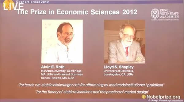2012年诺贝尔经济学奖揭晓 来源: 神秘的地球 时间:2012年10月16日 10:54 2012年诺贝尔经济学奖揭晓 2012年诺贝尔经济学奖刚刚揭晓,两名美国经济学家——哈佛大学教授埃尔文·罗斯(Alvin E. Roth)和加州大学洛杉矶分校教授罗伊德·沙普利(Lloyd S. Shapley)获奖。获奖理由是“稳定分配理论和市场设计实践”,二人将均分800万瑞典克朗奖金。 梅进 科学网 上一篇 下一篇 TAG: 经济学 诺贝尔奖
