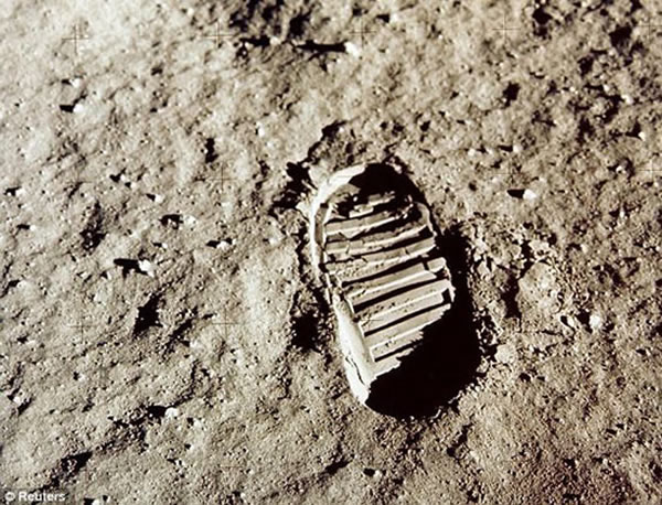 “阿波罗11”号飞船宇航员留下的脚印。月球表面覆盖着数米厚的土壤,科学家认为这或将使人类在月球上建立一个空间站,就地取水,并获得足够的水源。