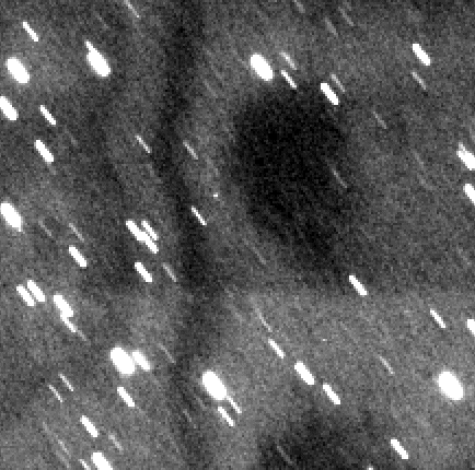 本图模拟潜在威胁小行星2008SE85在恒星间穿梭飞行的情形。由于模拟的是2008SE85的飞行过程,因此周围的恒星形成了移动的轨迹。