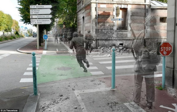 特怀斯是将二战时期的老照片与现在的街道实景重叠后,创造出如此令人惊讶的照片的。