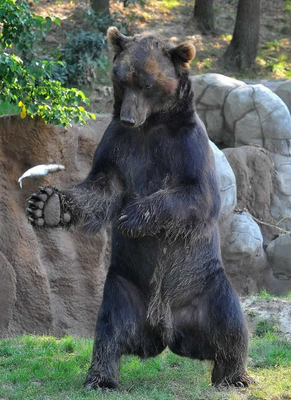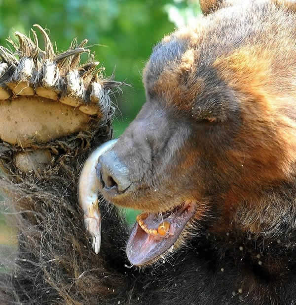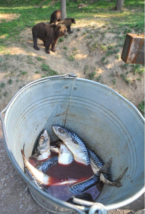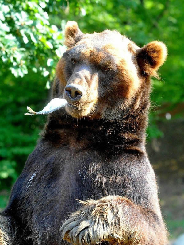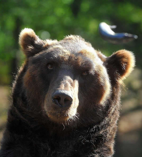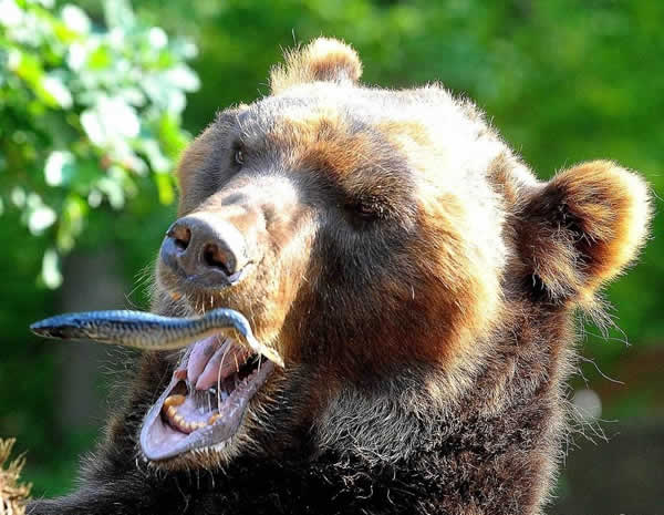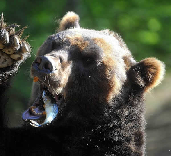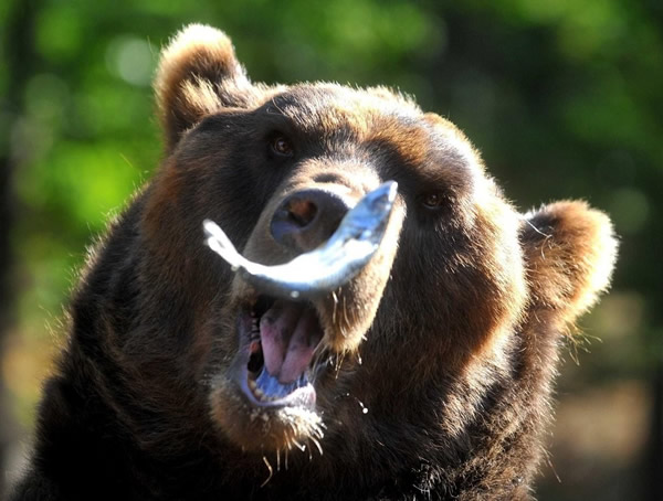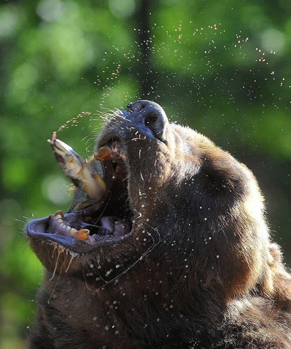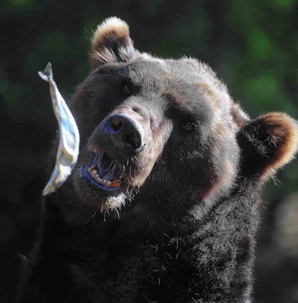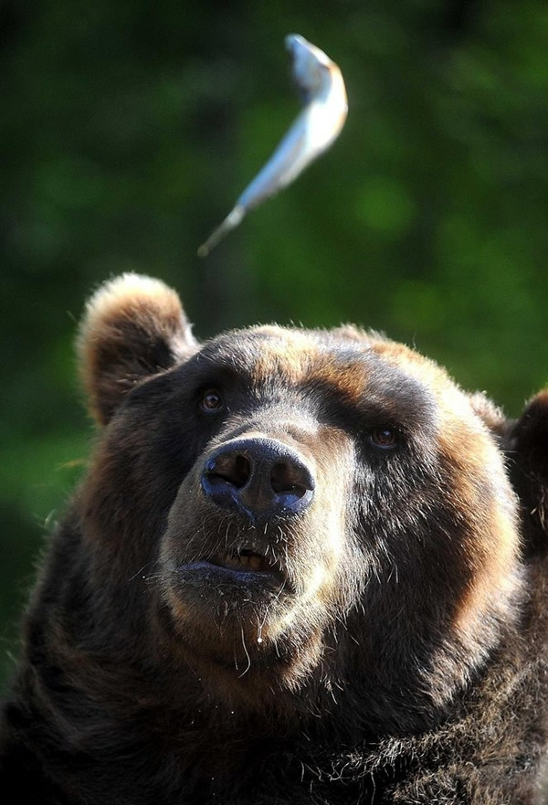 这只棕熊生活在捷克的一个动物园中,而摄影师拍到的正是棕熊晚餐时的照片。通过摄影师的镜头,可以看到这只棕熊张开大嘴,眼睛直直地盯着空中“飞”起的一条鲭鱼,并准确地用嘴咬住鲭鱼,吃到美餐。