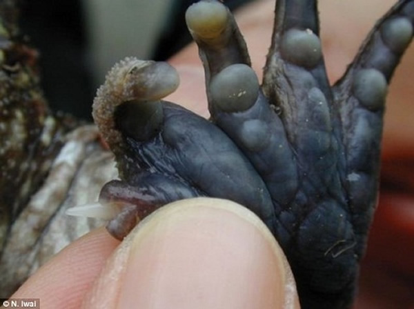 日本发现一种罕见青蛙 来源: 神秘的地球 时间:2012年10月20日 13:52 日本发现一种罕见青蛙 这种青蛙蹼上长有尖刺 日前研究人员在日本发现了一种罕见的青蛙,这种青蛙的蹼上长有一根尖锐的刺。研究人员分析,这根刺一般用于打斗和交配。 据报道,这种青蛙的蹼与其它青蛙蹼的形状不同,同时,在蹼的侧面还长有一根锐利的尖刺。研究人员称,雄性青蛙的刺要比雌性的刺更长,但只有雄性青蛙的刺才被用来打斗和交配。 研究人员说,雄性青蛙身体上的伤痕显示,它们常把尖刺作为武器打斗,用以争夺地盘和配偶。在交配时,雄性青蛙也会使用这根刺“固定”雌性青蛙。 中新网 上一篇 下一篇 TAG: 青蛙 日本