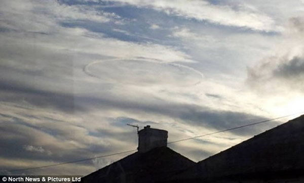 但英国气象局一名女发言人称,照片中的圆形是一种罕见的云,有可能是战斗机在天空盘旋,喷出的气凝结成了冰晶。
