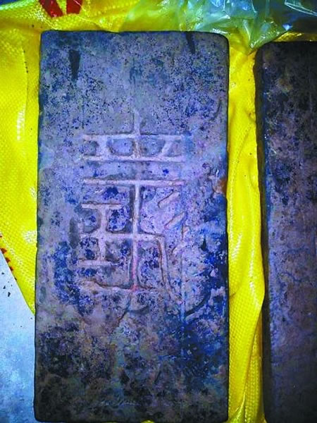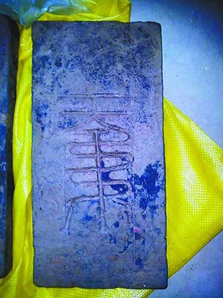 10号墓中出土了青瓷香薰、滑石猪、掌印砖等随葬品,此外,考古人员还在墓室前发现了一个祭台,祭台两侧摆放着4块青砖。这些青砖比墓砖稍小,每块砖体正面都刻着一个长约18厘米的神秘符号,每个符号都不尽相同。据记者观察,这些符号的局部形状可以拆解成“文”、“王”等文字,但所有笔画连在一起就成了无法解读的神秘符号。
