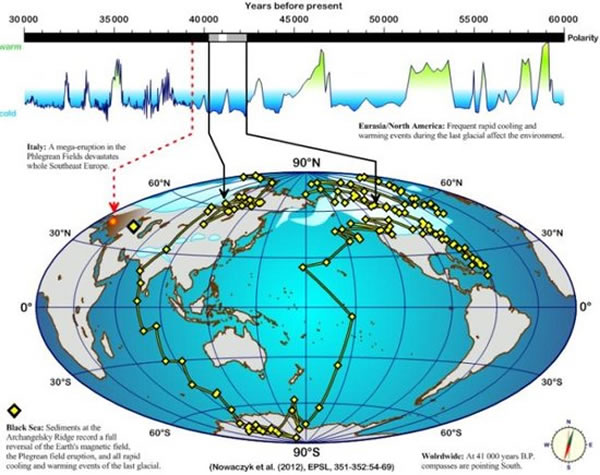 来自德国波茨坦地球科学研究中心的科学家对黑海沉积物样品进行分析后发现早在41,000年之前,地球磁场发生了整体性快速颠倒,该时期正处于最后一次的冰河时期,磁性分析结果显示当时黑海处的指南针正南方向为现在的北极。此外,研究数据也来自诺伯特·诺瓦奇克(Norbert Nowaczyk)博士与黑尔格·阿尔苏(Helge Arz)教授的研究小组对北大西洋、南太平洋和夏威夷的考察结果,证明了地球磁极颠倒是一个全球性的大事件。本项研究成果发表在最新一期的《科学》杂志地球和行星科学栏目上。
