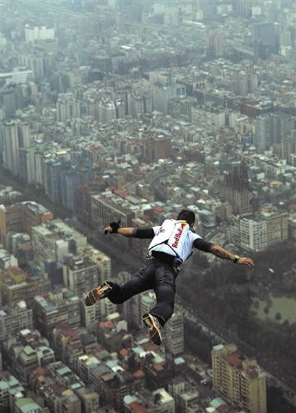 从当时世界最高楼中国台北市101大楼楼顶一跃而下,完成世界最高楼跳伞任务。