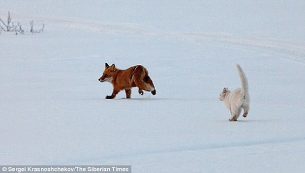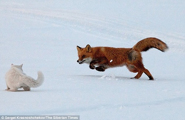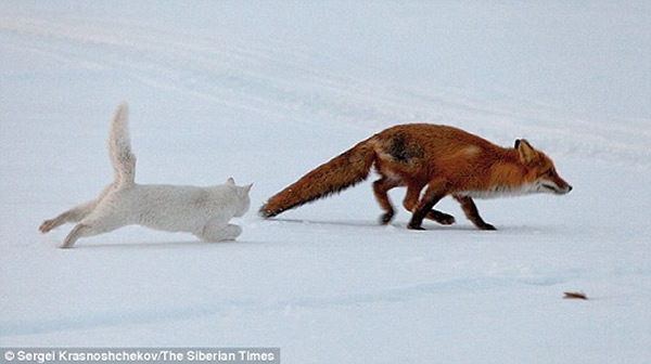 在人们一般的印象中,猫咪总是懒洋洋的,喜欢舒服地躺着晒太阳,很难想象它们会主动保卫家园。但俄罗斯就有只猫咪,主动出击,赶走了入侵其领地的狐狸,可谓霸气十足。
